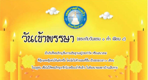 วันเข้าพรรษา จะตรงกับวันแรม ๑ ค่ำ เดือน ๘ ของทุกปี โดยในปีนี้ตรงกับวันที่ ๑๔ กรกฎาคม พ.ศ. ๒๕๖๕ ซึ่งเป็นวันที่พระภิกษุสงฆ์ เริ่มการอธิษฐานอยู่ประจำวัด หรือเสนาสนะที่คุ้มแดดคุ้มฝนได้แห่งหนึ่ง โดยไม่ไปค้างแรมที่อื่นเป็นระยะเวลา ๓ เดือนในฤดูฝน เพื่อไม่ให้พระภิกษุสงฆ์จาริกไปเหยียบย่ำต้นข้าวในท้องนาของชาวบ้านเสียหาย