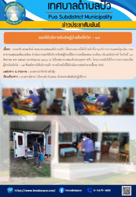 เนื้อหา : นายธวัช พรหมรักษ์ รองนายกเทศมนตรีตำบลปัว ได้มอบหมายให้เจ้าหน้าที่งานบริการการแพทย์ฉุกเฉิน กองสาธารณสุขและสิ่งแวดล้อม ดำเนินการออกให้บริการรับส่งผู้ป่วยที่มีอาการเหนื่อยหอบ อาเจียน บริเวณวัดปรางค์ ในวันที่ ๑๐ สิงหาคม พ.ศ. ๒๕๖๕ เวลาประมาณ ๑๘.๑๐ น. ไปโรงพยาบาลสมเด็จพระยุพราชปัว โดยภายหลังได้รับการตรวจพบเป็นผู้ป่วยโรคโควิด – ๑๙ ซึ่งหลังจากให้บริการแล้ว ทางเจ้าหน้าที่ได้ดำเนินการพ่นทำลายเชื้อรถ EMS