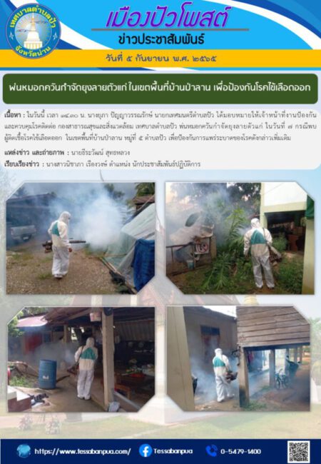 เนื้อหา : ในวันนี้ เวลา ๑๔.๓๐ น. นางยุภา ปัญญาวรรณรักษ์ นายกเทศมนตรีตำบลปัว ได้มอบหมายให้เจ้าหน้าที่งานป้องกันและควบคุมโรคติดต่อ กองสาธารณสุขและสิ่งแวดล้อม เทศบาลตำบลปัว พ่นหมอกควันกำจัดยุงลายตัวแก่ ในวันที่ ๗ กรณีพบผู้ติดเชื้อโรคไข้เลือดออก ในเขตพื้นที่บ้านป่าลาน หมู่ที่ ๕ ตำบลปัว เพื่อป้องกันการแพร่ระบาดของโรคดังกล่าวเพิ่มเติม