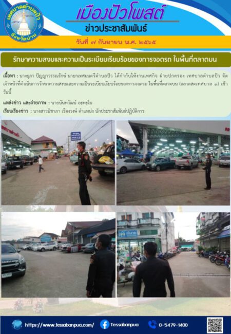 เนื้อหา : นางยุภา ปัญญาวรรณรักษ์ นายกเทศมนตรีตำบลปัว ได้กำกับให้งานเทศกิจ ฝ่ายปกครอง เทศบาลตำบลปัว จัดเจ้าหน้าที่ดำเนินการรักษาความสงบและความเป็นระเบียบเรียบร้อยของการจอดรถ ในพื้นที่ตลาดบน (ตลาดสดเทศบาล ๑) เช้าวันนี้