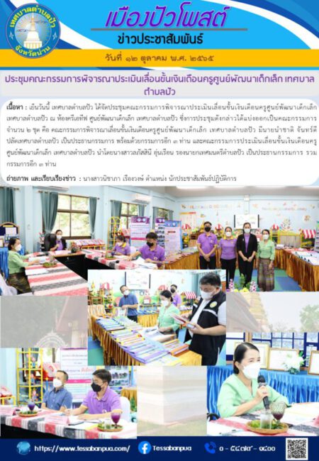 เนื้อหา : เย็นวันนี้ เทศบาลตำบลปัว ได้จัดประชุมคณะกรรมการพิจารณาประเมินเลื่อนขั้นเงินเดือนครูศูนย์พัฒนาเด็กเล็ก เทศบาลตำบลปัว ณ ห้องครีเอทีฟ ศูนย์พัฒนาเด็กเล็ก เทศบาลตำบลปัว ซึ่งการประชุมดังกล่าวได้แบ่งออกเป็นคณะกรรมการ จำนวน ๒ ชุด คือ คณะกรรมการพิจารณาเลื่อนขั้นเงินเดือนครูศูนย์พัฒนาเด็กเล็ก เทศบาลตำบลปัว มีนายนำชาติ จันทร์ดี ปลัดเทศบาลตำบลปัว เป็นประธานกรรมการ พร้อมด้วยกรรมการอีก ๓ ท่าน และคณะกรรมการประเมินเลื่อนขั้นเงินเดือนครูศูนย์พัฒนาเด็กเล็ก เทศบาลตำบลปัว นำโดยนางสาวลภัสสินี อุ่นเรือน รองนายกเทศมนตรีตำบลปัว เป็นประธานกรรมการ รวมกรรมการอีก ๓ ท่าน