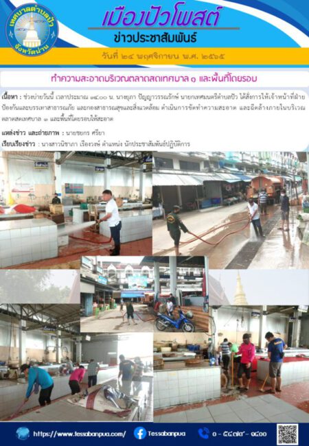 เนื้อหา : ช่วงบ่ายวันนี้ เวลาประมาณ ๑๔.๐๐ น. นางยุภา ปัญญาวรรณรักษ์ นายกเทศมนตรีตำบลปัว ได้สั่งการให้เจ้าหน้าที่ฝ่ายป้องกันและบรรเทาสาธารณภัย และกองสาธารณสุขและสิ่งแวดล้อม ดำเนินการขัดทำความสะอาด และฉีดล้างภายในบริเวณตลาดสดเทศบาล ๑ และพื้นที่โดยรอบให้สะอาด