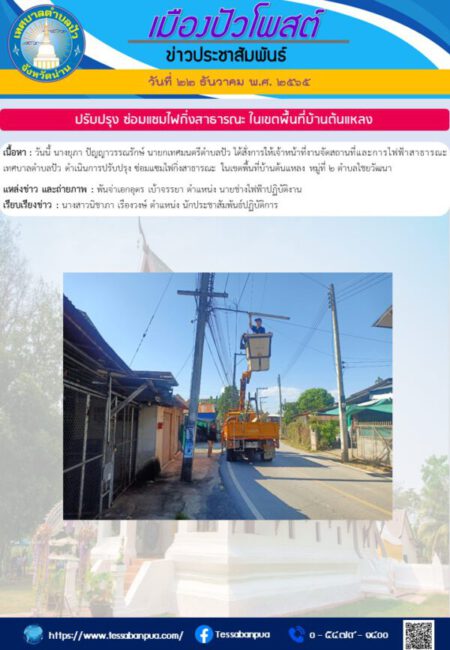 เนื้อหา : วันนี้ นางยุภา ปัญญาวรรณรักษ์ นายกเทศมนตรีตำบลปัว ได้สั่งการให้เจ้าหน้าที่งานจัดสถานที่และการไฟฟ้าสาธารณะ เทศบาลตำบลปัว ดำเนินการปรับปรุง ซ่อมแซมไฟกิ่งสาธารณะ ในเขตพื้นที่บ้านต้นแหลง หมู่ที่ ๒ ตำบลไชยวัฒนา