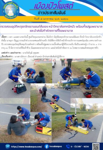 เนื้อหา : เวลา ๐๗.๕๕ น.ของวันนี้ ศูนย์วิทยุนเรนทรน่าน ได้แจ้งว่า มีอุบัติเหตุรถจักรยานยนต์ล้มเอง ที่หน้าวิทยาลัยเทคนิคปัว ดังนั้น นางยุภา ปัญญาวรรณรักษ์ นายกเทศมนตรีตำบลปัว จึงได้สั่งการให้เจ้าหน้าที่งานบริการการแพทย์ฉุกเฉิน เทศบาลตำบลปัว ตรวจสอบจุดเกิดอุบัติเหตุบริเวณดังกล่าว พร้อมทั้งปฐมพยาบาลเบื้องต้นแก่ผู้ได้รับบาดเจ็บ ซึ่งเป็นเพศหญิง จำนวน ๑ ราย อายุ ๓๐ ปี มีอาการปวดที่ข้อเท้าซ้าย มีแผลถลอกตามร่างกาย และนำส่งไปทำหัตถการ ณ โรงพยาบาลสมเด็จพระยุพราชปัว