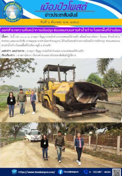 เนื้อหา : วันนี้ เวลา ๑๐.๐๐ น. นางยุภา ปัญญาวรรณรักษ์ นายกเทศมนตรีตำบลปัว พร้อมด้วยนางกัลยา จันเนย หัวหน้าฝ่ายปกครอง และนายเกริกชัย อาจผดุงกุล นายช่างโยธาชำนาญงาน ได้ร่วมกันออกสำรวจความคืบหน้าการปรับปรุง ซ่อมแซมถนนสายลำน้ำขว้าง ในเขตพื้นที่บ้านร้อง หมู่ที่ ๔ ตำบลปัว