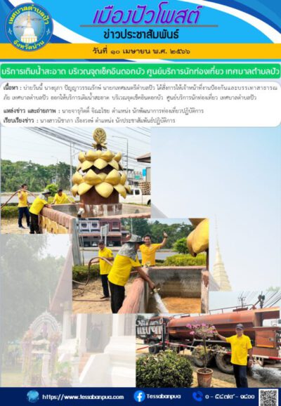 เนื้อหา : บ่ายวันนี้ นางยุภา ปัญญาวรรณรักษ์ นายกเทศมนตรีตำบลปัว ได้สั่งการให้เจ้าหน้าที่งานป้องกันและบรรเทาสาธารณภัย เทศบาลตำบลปัว ออกให้บริการเติมน้ำสะอาด บริเวณจุดเช็คอินดอกบัว ศูนย์บริการนักท่องเที่ยว เทศบาลตำบลปัว