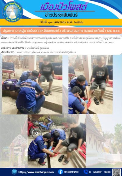 ปฐมพยาบาลผู้บาดเจ็บจากเหยียบเศษแก้ว บริเวณสวนสาธารณะอ่างเก็บน้ำ รศ. ๒๐๐