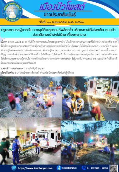 เนื้อหา : เวลา ๑๘.๓๕ น. ของวันนี้ โรงพยาบาลสมเด็จพระยุพราชปัว ได้แจ้งขอความอนุเคราะห์ให้เทศบาลตำบลปัว ออกให้บริการปฐมพยาบาล และออกรับส่งผู้บาดเจ็บจากอุบัติเหตุรถยนต์พลิกคว่ำ บริเวณทางโค้งร่องเย็น ถนนปัว – บ่อเกลือ ร่วมกับทีมงานกู้ชีพองค์การบริหารส่วนตำบลวรนคร , ทีมงานกู้ชีพเทศบาลตำบลศิลาแลง และมูลนิธิเพชรเกษม ในการนี้ นางยุภา ปัญญาวรรณรักษ์ นายกเทศมนตรีตำบลปัว จึงได้สั่งการให้เจ้าหน้าที่งานบริการการแพทย์ฉุกเฉิน เทศบาลตำบลปัว ออกให้บริการปฐมพยาบาลผู้บาดเจ็บ จากบริเวณดังกล่าว จากการตรวจสอบพบว่า มีผู้บาดเจ็บ จำนวน ๗ ราย และนำส่งไปรักษาที่โรงพยาบาลสมเด็จพระยุพราชปัวต่อไป