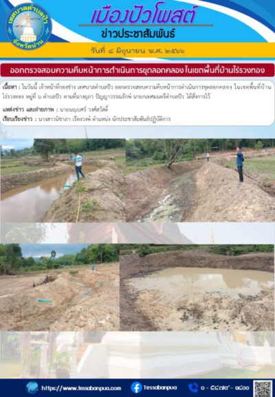 เนื้อหา : ในวันนี้ เจ้าหน้าที่กองช่าง เทศบาลตำบลปัว ออกตรวจสอบความคืบหน้าการดำเนินการขุดลอกคลอง ในเขตพื้นที่บ้านไร่รวงทอง หมู่ที่ ๖ ตำบลปัว ตามที่นางยุภา ปัญญาวรรณรักษ์ นายกเทศมนตรีตำบลปัว ได้สั่งการไว้