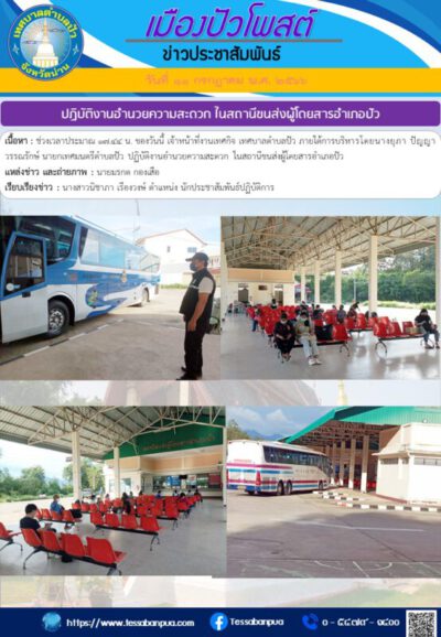 เนื้อหา : ช่วงเวลาประมาณ ๑๗.๔๔ น. ของวันนี้ เจ้าหน้าที่งานเทศกิจ เทศบาลตำบลปัว ภายใต้การบริหารโดยนางยุภา ปัญญาวรรณรักษ์ นายกเทศมนตรีตำบลปัว ปฏิบัติงานอำนวยความสะดวก ในสถานีขนส่งผู้โดยสารอำเภอปัว