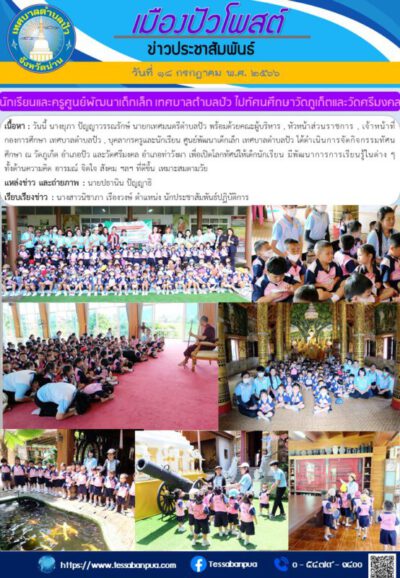 เนื้อหา : วันนี้ นางยุภา ปัญญาวรรณรักษ์ นายกเทศมนตรีตำบลปัว พร้อมด้วยคณะผู้บริหาร , หัวหน้าส่วนราชการ , เจ้าหน้าที่กองการศึกษา เทศบาลตำบลปัว , บุคลากรครูและนักเรียน ศูนย์พัฒนาเด็กเล็ก เทศบาลตำบลปัว ได้ดำเนินการจัดกิจกรรมทัศนศึกษา ณ วัดภูเก็ต อำเภอปัว และวัดศรีมงคล อำเภอท่าวังผา เพื่อเปิดโลกทัศน์ให้เด็กนักเรียน มีพัฒนาการการเรียนรู้ในต่าง ๆ ทั้งด้านความคิด อารมณ์ จิตใจ สังคม ฯลฯ ที่ดีขึ้น เหมาะสมตามวัย