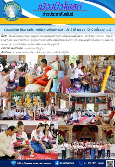 เนื้อหา : ในวันนี้ นางยุภา ปัญญาวรรณรักษ์ นายกเทศมนตรีตำบลปัว พร้อมด้วยคณะผู้บริหาร , สมาชิกสภาเทศบาล , หัวหน้าส่วนราชการ , พนักงานเทศบาล , ลูกจ้างเทศบาลตำบลปัว และผู้นำชุมชนบ้านไร่รวงทอง ร่วมกันอนุรักษ์ สืบสานประเพณีถวายเทียนพรรษา ประจำปี ๒๕๖๖ ณ วัดบ้านไร่รวงทอง ให้คงอยู่สืบไป