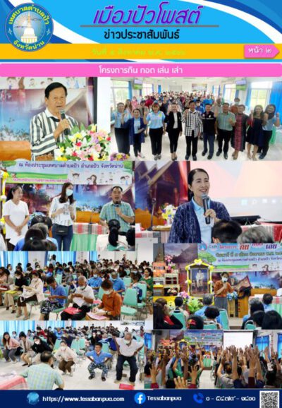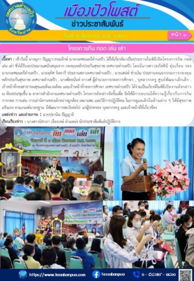 เนื้อหา : เช้าวันนี้ นางยุภา ปัญญาวรรณรักษ์ นายกเทศมนตรีตำบลปัว ได้ให้เกียรติมาเป็นประธานในพิธีเปิดโครงการกิน กอด เล่น เล่า ซึ่งได้รับงบประมาณสนับสนุนจาก กองทุนหลักประกันสุขภาพ เทศบาลตำบลปัว โดยมีนางสาวลภัสสินี อุ่นเรือน รองนายกเทศมนตรีตำบลปัว , นายอุทิศ จิตอารี ประธานสภาเทศบาลตำบลปัว , นายเสน่ห์ ช่างเงิน ประธานคณะกรรมการกองทุนหลักประกันสุขภาพ เทศบาลตำบลปัว , นางพัทธนันท์ ถาวงศ์ ผู้อำนวยการกองการศึกษา , บุคลากรครู ศูนย์พัฒนาเด็กเล็ก , เจ้าหน้าที่กองสาธารณสุขและสิ่งแวดล้อม และเจ้าหน้าที่กองการศึกษา เทศบาลตำบลปัว ได้ร่วมเป็นเกียรติในพิธีเปิดงานดังกล่าว ณ ห้องประชุมชั้น ๒ อาคารสำนักงานเทศบาลตำบลปัว โครงการดังกล่าวจัดขึ้นเพื่อ จัดให้มีการอบรมให้ความรู้เกี่ยวกับการกิน การกอด การเล่น การเล่านิทานของเด็กอย่างถูกต้อง เหมาะสม และวิธีการปฏิบัติตน ในการดูแลเด็กในด้านต่าง ๆ ให้มีสุขภาพแข็งแรง ตามเกณฑ์มาตรฐาน มีพัฒนาการสมวัยต่อไป แก่ผู้ปกครอง บุคลากรครู และเจ้าหน้าที่ที่เกี่ยวข้อง