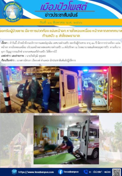เนื้อหา : ค่ำวันนี้ เจ้าหน้าที่งานบริการการแพทย์ฉุกเฉิน เทศบาลตำบลปัว ออกรับผู้ป่วยชาย อายุ ๔๑ ปี มีอาการปวดท้อง แน่นหน้าอก หายใจหอบเหนื่อย บริเวณหน้าตลาดสดเทศบาลตำบลปัว ๑ ส่งไปรักษา ณ โรงพยาบาลสมเด็จพระยุพราชปัว ตามที่นางยุภา ปัญญาวรรณรักษ์ นายกเทศมนตรีตำบลปัว ได้สั่งการไว้