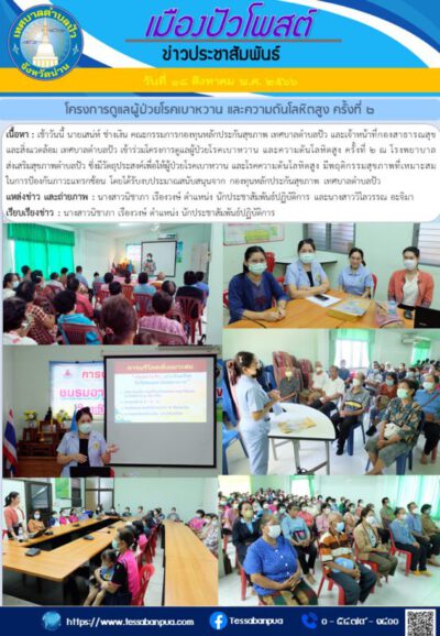 เนื้อหา : เช้าวันนี้ นายเสน่ห์ ช่างเงิน คณะกรรมการกองทุนหลักประกันสุขภาพ เทศบาลตำบลปัว และเจ้าหน้าที่กองสาธารณสุขและสิ่งแวดล้อม เทศบาลตำบลปัว เข้าร่วมโครงการดูแลผู้ป่วยโรคเบาหวาน และความดันโลหิตสูง ครั้งที่ ๒ ณ โรงพยาบาลส่งเสริมสุขภาพตำบลปัว ซึ่งมีวัตถุประสงค์เพื่อให้ผู้ป่วยโรคเบาหวาน และโรคความดันโลหิตสูง มีพฤติกรรมสุขภาพที่เหมาะสม ในการป้องกันภาวะแทรกซ้อน โดยได้รับงบประมาณสนับสนุนจาก กองทุนหลักประกันสุขภาพ เทศบาลตำบลปัว