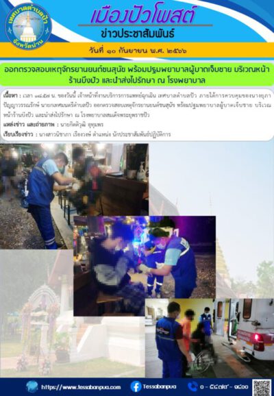 เนื้อหา : เวลา ๑๘.๕๗ น. ของวันนี้ เจ้าหน้าที่งานบริการการแพทย์ฉุกเฉิน เทศบาลตำบลปัว ภายใต้การควบคุมของนางยุภา ปัญญาวรรณรักษ์ นายกเทศมนตรีตำบลปัว ออกตรวจสอบเหตุจักรยานยนต์ชนสุนัข พร้อมปฐมพยาบาลผู้บาดเจ็บชาย บริเวณหน้าร้านบึงปัว และนำส่งไปรักษา ณ โรงพยาบาลสมเด็จพระยุพราชปัว