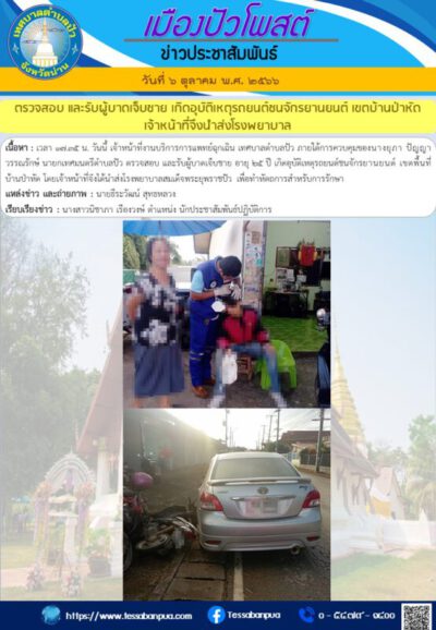 เนื้อหา : เวลา ๑๗.๓๕ น. วันนี้ เจ้าหน้าที่งานบริการการแพทย์ฉุกเฉิน เทศบาลตำบลปัว ภายใต้การควบคุมของนางยุภา ปัญญาวรรณรักษ์ นายกเทศมนตรีตำบลปัว ตรวจสอบ และรับผู้บาดเจ็บชาย อายุ ๒๕ ปี เกิดอุบัติเหตุรถยนต์ชนจักรยานยนต์ เขตพื้นที่บ้านป่าหัด โดยเจ้าหน้าที่จึงได้นำส่งโรงพยาบาลสมเด็จพระยุพราชปัว เพื่อทำหัตถการสำหรับการรักษา