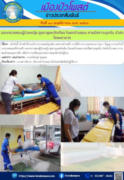 เนื้อหา : เย็นวันนี้ เจ้าหน้าที่งานบริการการแพทย์ฉุกเฉิน เทศบาลตำบลปัว ภายใต้การควบคุมของนางยุภา ปัญญาวรรณรักษ์ นายกเทศมนตรีตำบลปัว ออกตรวจสอบผู้ป่วยหญิง สูงอายุและติดเตียง ในเขตบ้านขอน สายปัสสาวะอุดตัน นำส่งไปโรงพยาบาลสมเด็จพระยุพราชปัว เพื่อทำการเปลี่ยนอุปกรณ์การแพทย์สำหรับผู้ป่วย