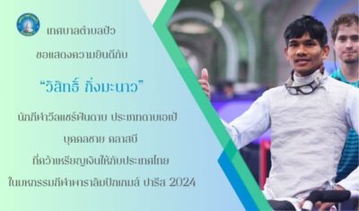 เทศบาลตำบลปัว ขอแสดงความยินดีกับ “วิสิทธิ์ กิ่งมะนาว” นักกีฬาวีลแชร์ฟันดาบ ประเภทดาบเอเป้ บุคคลชาย คลาสบี ที่คว้าเหรียญเงินให้กับประเทศไทย ในมหกรรมกีฬาพาราลิมปิกเกมส์ ปารีส 2024