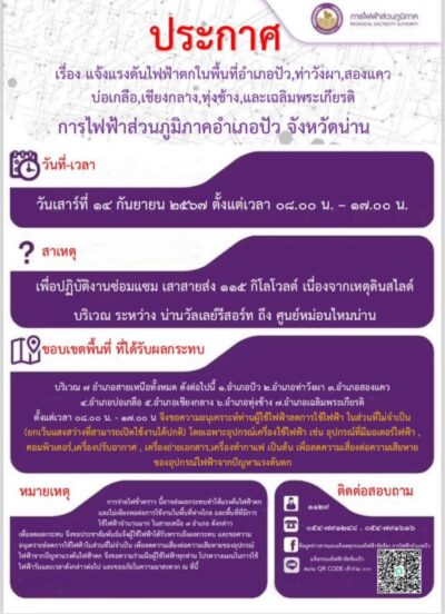 ด้วย การไฟฟ้าส่วนภูมิภาคอำเภอปัว มีแผนงานที่จะต้องดำเนินการซ่อมแซมเสาสายส่ง ๑๑๕ กิโลโวลต์ ต่ออีก ๑ วัน เนื่องจากเกิดเหตุดินสไลด์ บริเวณน่านวัลเลย์รีสอร์ท ถึงศูนย์หม่อนไหมน่าน ซึ่งการปฏิบัติงานดังกล่าว อาจส่งผลกระทบให้แรงดันไฟฟ้าตก และเกิดไฟฟ้าดับได้ ในวันเสาร์ที่ ๑๔ กันยายน พ.ศ. ๒๕๖๗ ตั้งแต่เวลา ๐๘.๐๐ – ๑๗.๐๐ น. ในพื้นที่ห่างไกล และพื้นที่ที่มีการใช้ไฟฟ้าจำนวนมากในเขตอำเภอปัว , อำเภอทุ่งช้าง , อำเภอสองแคว , อำเภอเชียงกลาง , อำเภอบ่อเกลือ , อำเภอเฉลิมพระเกียรติ , อำเภอท่าวังผา