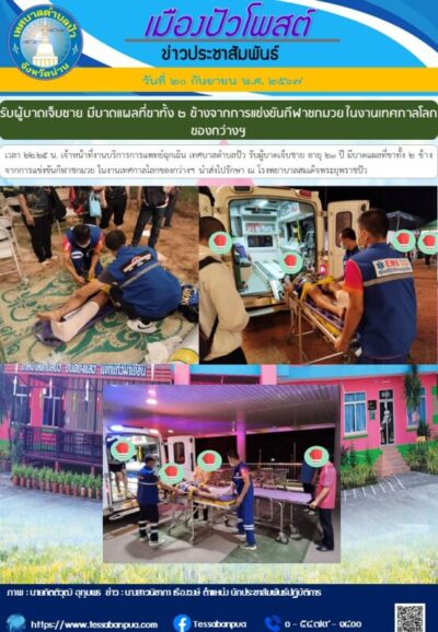 รับผู้บาดเจ็บชาย มีบาดแผลที่ขาทั้ง ๒ ข้างจากการแข่งขันกีฬาชกมวย ในงานเทศกาลโลกของกว่างฯ 20 กันยายน 256722 กันยายน 2024เทศบาลปัว1ภาพกิจกรรม FacebookFacebookXTwitterLINELine