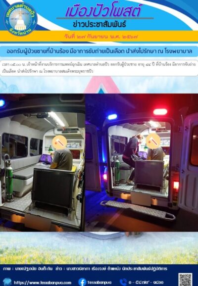 ออกรับผู้ป่วยชายที่บ้านร้อง มีอาการขับถ่ายเป็นเลือด นำส่งไปรักษา ณ โรงพยาบาล