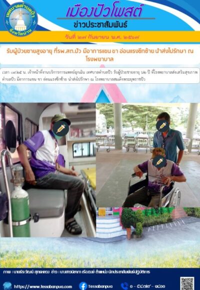 รับผู้ป่วยชายสูงอายุ ที่รพ.สต.ปัว มีอาการแขน ขา อ่อนแรงซีกซ้าย นำส่งไปรักษา ณ โรงพยาบาล 27 กันยายน 256728 กันยายน 2024เทศบาลปัว1ภาพกิจกรรม FacebookFacebookXTwitterLINELine