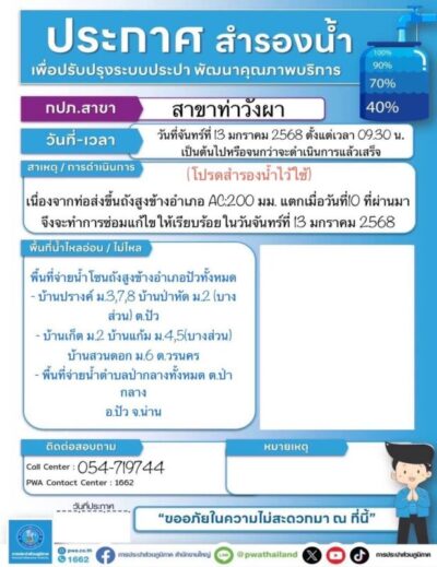 การประปาส่วนภูมิภาค สาขาท่าวังผา ได้แจ้งประชาสัมพันธ์ ขอหยุดจ่ายน้ำประปาชั่วคราวในพื้นที่จ่ายน้ำโซนถังสูงข้างอำเภอปัวทั้งหมด ในเขตบ้านป่าหัดบางส่วน , บ้านปรางค์ , บ้านปรางค์พัฒนา ๑ , บ้านปรางค์พัฒนา ๒ , บ้านแก้มบางส่วน และบ้านสวนดอก ในวันนี้ (วันที่ ๑๓ มกราคม พ.ศ. ๒๕๖๘) ตั้งแต่เวลา ๐๙.๓๐ น. เป็นต้นไป จนกว่าจะดำเนินการแล้วเสร็จ เนื่องจากดำเนินการแก้ไข ซ่อมแซมท่อ AC ขนาด ๒๐๐ มิลลิเมตร (ท่อส่งน้ำขึ้นถังสูงข้างอำเภอปัว) แแตก บริเวณสถานีบริการน้ำมันเชื้อเพลิง ปตท. เก่า ตรงข้ามสนามกีฬาพญาผานอง ต่อให้แล้วเสร็จจากวันที่ ๑๐ มกราคม พ.ศ. ๒๕๖๘ ที่ผ่านมา ทั้งนี้ หากดำเนินการแล้วเสร็จ จะดำเนินการจ่ายน้ำตามปกติทันที โดยอาจพบน้ำขุ่นมีสีแดงและตะกอนเล็กน้อยภายหลังการซ่อม การประปาส่วนภูมิภาคฯ ต้องขออภัยในความไม่สะดวกมา ณ โอกาสนี้ สอบถามรายละเอียดเพิ่มเติมได้ที่เบอร์ ๐๕๔ – ๗๑๙๗๔๔ หรือ ๑๖๖๒