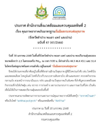 ดังนั้น จึงขอให้ประชาชนเฝ้าระวังสุขภาพ สำหรับผู้ที่มีโรคประจำตัว เช่น โรคหัวใจและหลอดเลือด , โรคภูมิแพ้ , โรคที่เกี่ยวกับระบบทางเดินหายใจ รวมถึงเด็ก และคนชรา ควรงดกิจกรรมกลางแจ้ง และสวมหน้ากากาอนามัยแบบ N ๙๕ ที่สำคัญควรงดหรือลดกิจกรรมที่ก่อให้เกิดฝุ่น เช่น จราจร , การก่อสร้าง , สถานประกอบการ และการเผาในที่โล่ง เป็นต้น เพื่อไม่ให้เป็นการสะสมปริมาณฝุ่นละอองในพื้นที่ ประชาชนสามารถติดตามรายงานสถานการณ์คุณภาพอากาศ ได้ที่เพจ Facebook อากาศบ้านเฮา หรือเว็บไซต์ “air4thai.pcd.go.th” หรือแอปพลิเคชั่น “Air4Thai”