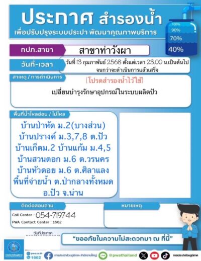 ด้วยการประปาส่วนภูมิภาค สาขาท่าวังผา ได้แจ้งประชาสัมพันธ์ ขอหยุดจ่ายน้ำประปาชั่วคราว บริเวณบ้านป่าหัด บางส่วน , บ้านปรางค์ , บ้านปรางค์พัฒนา ๑ และบ้านปรางค์พัฒนา ๒ , บ้านแก้มราษฎร์พัฒนา , บ้านแก้ม และบ้านสวนดอก ในวันนี้​ (วันที่​ ๑๓ กุมภาพันธ์ พ.ศ.​ ๒๕๖๘) ตั้งแต่เวลา ๒๓.๐๐ น. เป็นต้นไป จนกว่าจะดำเนินการแล้วเสร็จ​ เนื่องจากดำเนินการเปลี่ยนบำรุงรักษาอุปกรณ์ในระบบผลิตน้ำประปาอำเภอปัว โดยขอให้ประชาชนในพื้นที่ดังกล่าวโปรดสำรองน้ำไว้ใช้ ทั้งนี้ หากดำเนินการแล้วเสร็จ จะดำเนินการจ่ายน้ำตามปกติทันที โดยอาจพบน้ำขุ่นมีสีแดงและตะกอนเล็กน้อยภายหลังการซ่อม การประปาส่วนภูมิภาคฯ ต้องขออภัยในความไม่สะดวกมา ณ โอกาสนี้ สอบถามรายละเอียดเพิ่มเติมได้ที่เบอร์ ๐๕๔ – ๗๑๙๗๔๔ หรือ ๑๖๖๒