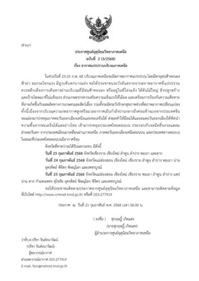 ด้วย ศูนย์อุตุนิยมวิทยาภาคเหนือ ได้แจ้งประชาสัมพันธ์ประกาศ ฉบับที่ ๒ เรื่อง อากาศแปรปรวน บริเวณภาคเหนือ ซึ่งระบุว่า บริเวณความกดอากาศสูง หรือมวลอากาศเย็นกำลังปานกลางถึงค่อนข้างแรง จากประเทศจีน จะแผ่ลงมาปกคลุมภาคตะวันออกเฉียงเหนือ และทะเลจีนใต้ ส่งผลทำให้มีลมใต้ และลมตะวันออกเฉียงใต้ พัดนำความชื้นจากทะเลจีนใต้และอ่าวไทย เข้ามาปกคลุมประเทศไทยตอนบน ประกอบกับมีคลื่นกระแสลมฝ่ายตะวันตก จากประเทศเมียนมาเคลื่อนผ่านภาคเหนือ ภาคตะวันออกเฉียงเหนือตอนบน และประเทศลาวตอนบน ในขณะที่ประเทศไทยตอนบนมีอากาศร้อน ส่งผลให้ระหว่างวันที่ ๒๓ – ๒๕ กุมภาพันธ์ พ.ศ. ๒๕๖๘ ของบริเวณภาคเหนือจะมีสภาพอากาศแปรปรวน มีพายุฝนฟ้าคะนอง ฟ้าผ่า ลมกระโชกแรง มีลูกเห็บตกในบางแห่ง ดังนั้น จึงขอแจ้งให้ประชาชนระวังอันตรายจากสภาพอากาศที่แปรปรวน ควรหลีกเลี่ยงการเดินทางผ่านบริเวณที่มีฝนฟ้าคะนอง หรืออยู่ในที่โล่งแจ้ง ใต้ต้นไม้ใหญ่ สิ่งปลูกสร้าง และป้ายโฆษณาที่ไม่แข็งแรง สำหรับเกษตรกรควรเสริมความแข็งแรงให้ไม้ผล และเตรียมการป้องกันความเสียหาย ที่อาจเกิดขึ้นกับผลผลิตทางการเกษตรและสัตว์เลี้ยง รวมทั้งรักษาสุขภาพในช่วงที่สภาพอากาศเปลี่ยนแปลง