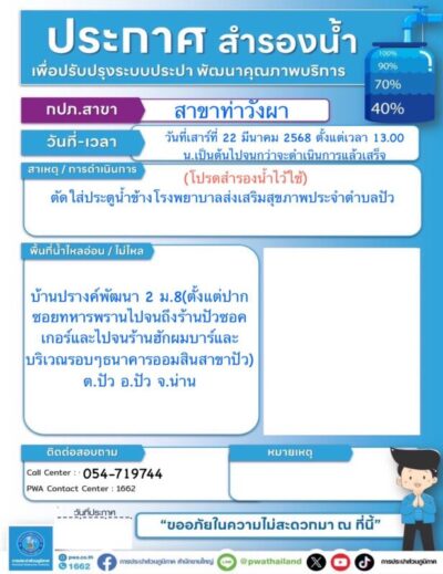 ด้วยการประปาส่วนภูมิภาค สาขาท่าวังผา ได้แจ้งประชาสัมพันธ์ ขอหยุดจ่ายน้ำประปาชั่วคราว ในพื้นที่บ้านปรางค์พัฒนา ๒ บางส่วน ตั้งแต่หน้าปากทางเข้ากรมทหารพรานที่ ๓๒ ไปจนถึงร้านปัวซอคเกอร์ รวมถึงร้านปัวฮักบาร์ และบริเวณธนาคารออมสิน สาขาปัว ในวันนี้​ (วันเสาร์ที่​ ๒๒ มีนาคม พ.ศ.​ ๒๕๖๘) ตั้งแต่เวลา ๑๓.๐๐ น. เป็นต้นไป จนกว่าจะดำเนินการแล้วเสร็จ​ เนื่องจากจะดำเนินการตัดใส่ประตูน้ำข้างโรงพยาบาลส่งเสริมสุขภาพตำบลปัว โดยขอให้ประชาชนในพื้นที่ดังกล่าวโปรดสำรองน้ำไว้ใช้ ทั้งนี้ หากดำเนินการแล้วเสร็จ จะดำเนินการจ่ายน้ำตามปกติทันที โดยอาจพบน้ำขุ่นมีสีแดง และตะกอนเล็กน้อยภายหลังการซ่อม การประปาส่วนภูมิภาคฯ ต้องขออภัยในความไม่สะดวกมา ณ โอกาสนี้ สอบถามรายละเอียดเพิ่มเติมได้ที่เบอร์ ๐๕๔ – ๗๑๙๗๔๔ หรือ ๑๖๖๒