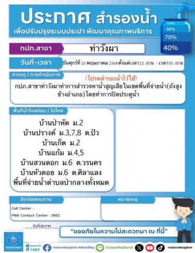 ด้วยการประปาส่วนภูมิภาค สาขาท่าวังผา ได้แจ้งประชาสัมพันธ์ ขอหยุดจ่ายน้ำประปาชั่วคราว ในพื้นที่บ้านป่าหัด , บ้านปรางค์ , บ้านปรางค์พัฒนา ๑ , บ้านปรางค์พัฒนา ๒ , บ้านแก้มราษฎร์พัฒนา , บ้านแก้ม และบ้านสวนดอก ในวันนี้ (วันศุกร์ที่ ๑๖ พฤษภาคม พ.ศ. ๒๕๖๘) ตั้งแต่เวลา ๒๒.๐๐ – ๐๕.๐๐ น. ของวันถัดไป เนื่องจากจะสำรวจหาน้ำสูญเสีย ในเขตพื้นที่จ่ายน้ำ (ถังสูงข้างอำเภอ) โดยทำการปิดประตูน้ำ ขอให้ประชาชนในพื้นที่ดังกล่าวโปรดสำรองน้ำไว้ใช้ ทั้งนี้ หากดำเนินการแล้วเสร็จ จะดำเนินการจ่ายน้ำตามปกติทันที ซึ่งอาจพบน้ำขุ่นมีสีแดง และตะกอนเล็กน้อยภายหลังการซ่อม การประปาส่วนภูมิภาคฯ ต้องขออภัยในความไม่สะดวกมา ณ โอกาสนี้ สอบถามรายละเอียดเพิ่มเติมได้ที่เบอร์ ๐๕๔ – ๗๑๙๗๔๔ หรือ ๑๖๖๒