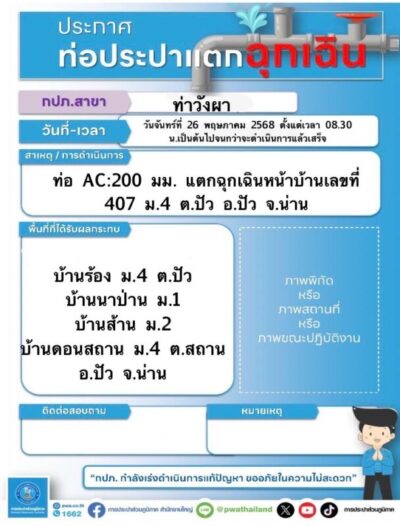 ด้วยการประปาส่วนภูมิภาค สาขาท่าวังผา ได้แจ้งประชาสัมพันธ์ ขอหยุดจ่ายน้ำประปาชั่วคราว ในพื้นที่บ้านร้อง และบ้านนาป่าน ในวันนี้ (วันจันทร์ที่ ๒๖ พฤษภาคม พ.ศ. ๒๕๖๘) ตั้งแต่เวลา ๐๘.๓๐ น. จนกว่าจะดำเนินการแล้วเสร็จ เนื่องจากท่อ AC ขนาด ๒๐๐ มิลลิเมตร แตกฉุกเฉินหน้าบ้านเลขที่ ๔๐๗ หมู่ ๔ ตำบลปัว อำเภอปัว จังหวัดน่าน ทั้งนี้ หากดำเนินการแล้วเสร็จ จะดำเนินการจ่ายน้ำตามปกติทันที ซึ่งอาจพบน้ำขุ่นมีสีแดง และตะกอนเล็กน้อยภายหลังการซ่อม การประปาส่วนภูมิภาคฯ ต้องขออภัยในความไม่สะดวกมา ณ โอกาสนี้ สอบถามรายละเอียดเพิ่มเติมได้ที่เบอร์ ๐๕๔ – ๗๑๙๗๔๔ หรือ ๑๖๖๒