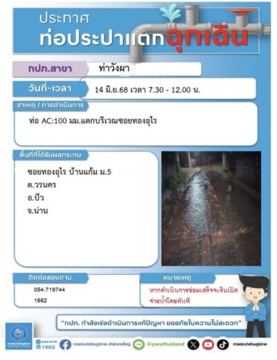 ด้วยการประปาส่วนภูมิภาค สาขาท่าวังผา ได้แจ้งประชาสัมพันธ์ ขอหยุดจ่ายน้ำประปาชั่วคราว บริเวณซอยทองอุไร บ้านแก้ม ในวันนี้ (วันเสาร์ที่ ๑๔ มิถุนายน พ.ศ. ๒๕๖๘) ตั้งแต่เวลา ๐๗.๓๐ – ๑๒.๐๐ น. เนื่องจากท่อ AC ขนาด ๑๐๐ มิลลิเมตร แตกบริเวณซอยทองอุไร ทั้งนี้ หากดำเนินการแล้วเสร็จ จะดำเนินการจ่ายน้ำตามปกติทันที โดยอาจพบน้ำขุ่นมีสีแดง และตะกอนเล็กน้อยภายหลังการซ่อม การประปาส่วนภูมิภาคฯ ต้องขออภัยในความไม่สะดวกมา ณ โอกาสนี้ สอบถามรายละเอียดเพิ่มเติมได้ที่เบอร์ ๐๕๔ – ๗๑๙๗๔๔ หรือ ๑๖๖๒