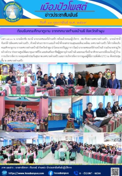 วันที่ ๑๓ กุมภาพันธ์ พ.ศ. ๒๕๖๙ เวลา ๐๙.๐๐ น. นายฉัตรชัย ธนามี นายกเทศมนตรีตำบลปัว พร้อมด้วยคณะผู้บริหาร , สมาชิกสภาเทศบาลตำบลปัว , นายนำชาติ จันทร์ดี ปลัดเทศบาลตำบลปัว , หัวหน้าส่วนราชการ และเจ้าหน้าที่กองสาธารณสุขและสิ่งแวดล้อม เทศบาลตำบลปัว ให้การต้อนรับคณะศึกษาดูงาน จากเทศบาลตำบลบ้านธิ จังหวัดลำพูน นำโดยนายปริญญา ขาววัฒน์ นายกเทศมนตรีตำบลบ้านธิ รวมถึงนายชาญวิช อภิวงค์งาม ประธานศูนย์พัฒนาคุณภาพชีวิต และส่งเสริมอาชีพผู้สูงอายุตำบลบ้านธิ และคณะ ซึ่งเข้ามาศึกษาแลกเปลี่ยนเรียนรู้ ด้านการบริหารจัดการ กองทุนหลักประกันสุขภาพ เทศบาลตำบลปัว และการบริหารจัดการการดูแลผู้ที่มีภาวะพึ่งพิง (LTC) ณ ห้องประชุม ชั้น ๒ เทศบาลตำบลปัว