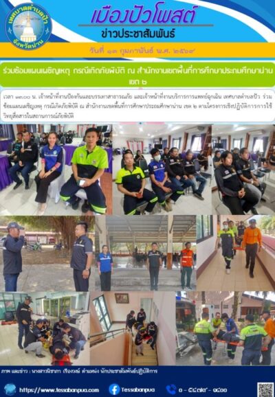 วันที่ ๑๓ กุมภาพันธ์ พ.ศ. ๒๕๖๙ เวลา ๑๓.๐๐ น. เจ้าหน้าที่งานป้องกันและบรรเทาสาธารณภัย และเจ้าหน้าที่งานบริการการแพทย์ฉุกเฉิน เทศบาลตำบลปัว ร่วมซ้อมแผนเผชิญเหตุ กรณีเกิดภัยพิบัติ ณ สำนักงานเขตพื้นที่การศึกษาประถมศึกษาน่าน เขต ๒ ตามโครงการเชิงปฏิบัติการการใช้วิทยุสื่อสารในสถานการณ์ภัยพิบัติ