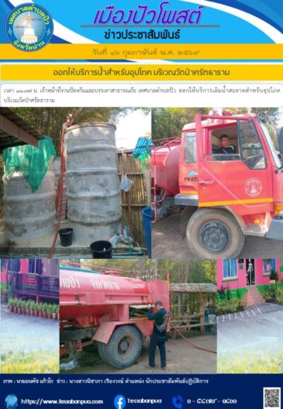 วันที่ ๑๖ กุมภาพันธ์ พ.ศ. ๒๕๖๙ เวลา ๑๑.๓๗ น. เจ้าหน้าที่งานป้องกันและบรรเทาสาธารณภัย เทศบาลตำบลปัว ออกให้บริการเติมน้ำสะอาดสำหรับอุปโภค บริเวณวัดป่าศรัทธาราม