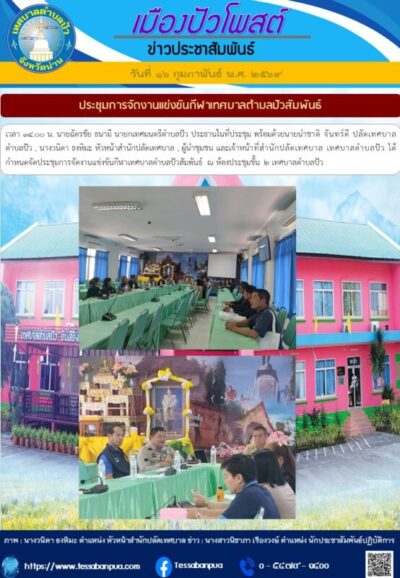 วันที่ ๑๖ กุมภาพันธ์ พ.ศ. ๒๕๖๙ นายฉัตรชัย ธนามี นายกเทศมนตรีตำบลปัว ประธานในที่ประชุม พร้อมด้วยนายนำชาติ จันทร์ดี ปลัดเทศบาลตำบลปัว , นางวนิดา ธงหิมะ หัวหน้าสำนักปลัดเทศบาล , ผู้นำชุมชน และเจ้าหน้าที่สำนักปลัดเทศบาล เทศบาลตำบลปัว ได้กำหนดจัดประชุมการจัดงานแข่งขันกีฬาเทศบาลตำบลปัวสัมพันธ์ ณ ห้องประชุมชั้น ๒ เทศบาลตำบลปัว