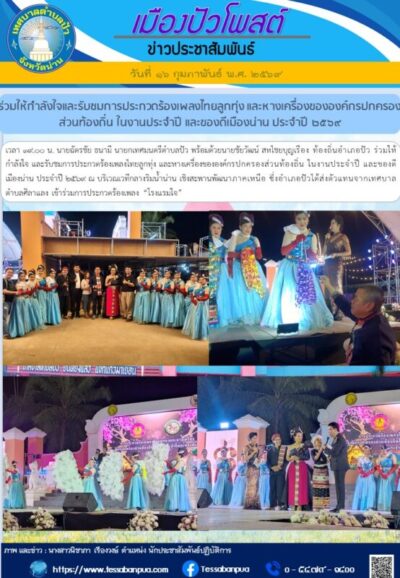 วันที่ ๑๖ กุมภาพันธ์ พ.ศ. ๒๕๖๙ เวลา ๑๙.๐๐ น. นายฉัตรชัย ธนามี นายกเทศมนตรีตำบลปัว พร้อมด้วยนายชัยวัฒน์ สหไชยบุญเรือง ท้องถิ่นอำเภอปัว ร่วมให้กำลังใจ และรับชมการประกวดร้องเพลงไทยลูกทุ่ง และหางเครื่องขององค์กรปกครองส่วนท้องถิ่น ในงานประจำปี และของดีเมืองน่าน ประจำปี ๒๕๖๙ ณ บริเวณเวทีกลางริมน้ำน่าน เชิงสะพานพัฒนาภาคเหนือ ซึ่งอำเภอปัวได้ส่งตัวแทนจากเทศบาลตำบลศิลาแลง เข้าร่วมการประกวดร้องเพลง “โรงแรมใจ”