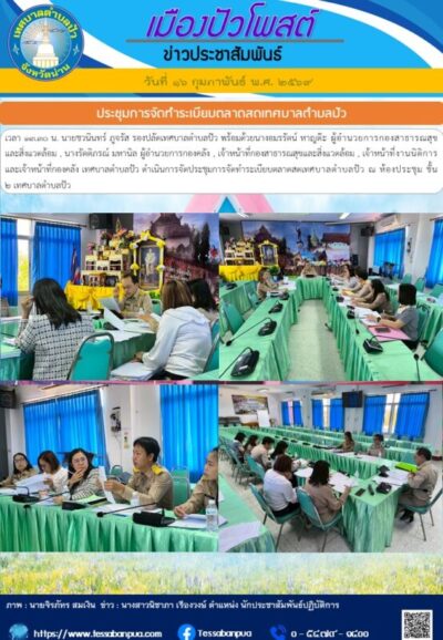 วันที่ ๑๖ กุมภาพันธ์ พ.ศ. ๒๕๖๙ เวลา ๑๓.๓๐ น. นายชวนินทร์ ภูจรัส รองปลัดเทศบาลตำบลปัว พร้อมด้วยนางอมรรัตน์ หาญต๊ะ ผู้อำนวยการกองสาธารณสุขและสิ่งแวดล้อม , นางรัตติภรณ์ มหานิล ผู้อำนวยการกองคลัง , เจ้าหน้าที่กองสาธารณสุขและสิ่งแวดล้อม , เจ้าหน้าที่งานนิติการ และเจ้าหน้าที่กองคลัง เทศบาลตำบลปัว ดำเนินการจัดประชุมการจัดทำระเบียบตลาดสดเทศบาลตำบลปัว ณ ห้องประชุม ชั้น ๒ เทศบาลตำบลปัว