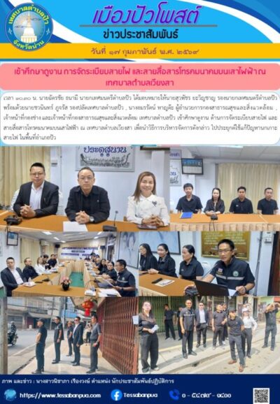 วันที่ ๑๗ กุมภาพันธ์ พ.ศ. ๒๕๖๙ เวลา ๑๐.๓๐ น. นายฉัตรชัย ธนามี นายกเทศมนตรีตำบลปัว ได้มอบหมายให้นายสุวพัชร ยะวิญชาญ รองนายกเทศมนตรีตำบลปัว พร้อมด้วยนายชวนินทร์ ภูจรัส รองปลัดเทศบาลตำบลปัว , นางอมรรัตน์ หาญต๊ะ ผู้อำนวยการกองสาธารณสุขและสิ่งแวดล้อม , เจ้าหน้าที่กองช่าง และเจ้าหน้าที่กองสาธารณสุขและสิ่งแวดล้อม เทศบาลตำบลปัว เข้าศึกษาดูงาน ด้านการจัดระเบียบสายไฟ และสายสื่อสารโทรคมนาคมบนเสาไฟฟ้า ณ เทศบาลตำบลเวียงสา เพื่อนำวิธีการบริหารจัดการดังกล่าว ไปประยุกต์ใช้แก้ปัญหานกเกาะสายไฟ ในพื้นที่อำเภอปัว