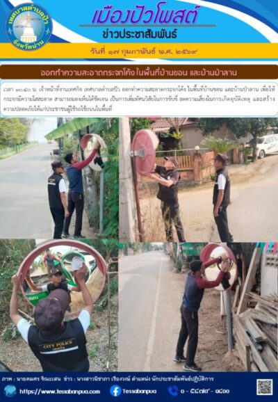 วันที่ ๑๗ กุมภาพันธ์ พ.ศ. ๒๕๖๙ เวลา ๑๐.๔๐ น. เจ้าหน้าที่งานเทศกิจ เทศบาลตำบลปัว ออกทำความสะอาดกระจกโค้ง ในพื้นที่บ้านขอน และบ้านป่าลาน เพื่อให้กระจกมีความใสสะอาด สามารถมองเห็นได้ชัดเจน เป็นการเพิ่มทัศนวิสัยในการขับขี่ ลดความเสี่ยงในการเกิดอุบัติเหตุ และสร้างความปลอดภัยให้แก่ประชาชนผู้ใช้รถใช้ถนนในพื้นที่