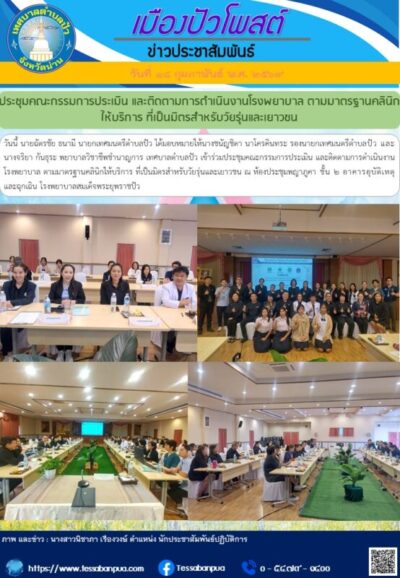 วันที่ ๑๘ กุมภาพันธ์ พ.ศ. ๒๕๖๙ นายฉัตรชัย ธนามี นายกเทศมนตรีตำบลปัว ได้มอบหมายให้นางชนัญชิดา นาโครคินทระ รองนายกเทศมนตรีตำบลปัว และนางจริยา กันธุระ พยาบาลวิชาชีพชำนาญการ เทศบาลตำบลปัว เข้าร่วมประชุมคณะกรรมการประเมิน และติดตามการดำเนินงานโรงพยาบาล ตามมาตรฐานคลินิกให้บริการ ที่เป็นมิตรสำหรับวัยรุ่นและเยาวชน ณ ห้องประชุมพญาภูคา ชั้น ๒ อาคารอุบัติเหตุและฉุกเฉิน โรงพยาบาลสมเด็จพระยุพราชปัว