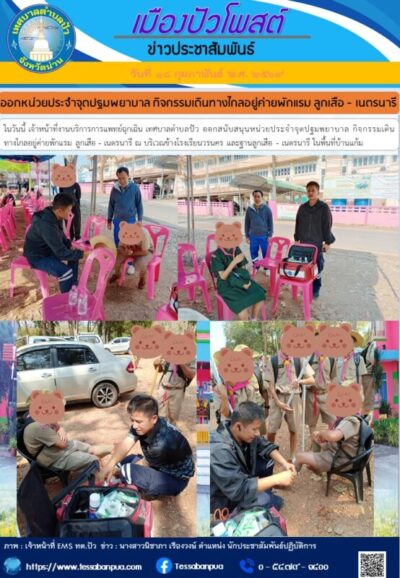วันที่ ๑๘ กุมภาพันธ์ พ.ศ. ๒๕๖๙ เจ้าหน้าที่งานบริการการแพทย์ฉุกเฉิน เทศบาลตำบลปัว ออกสนับสนุนหน่วยประจำจุดปฐมพยาบาล กิจกรรมเดินทางไกลอยู่ค่ายพักแรม ลูกเสือ – เนตรนารี ณ บริเวณข้างโรงเรียนวรนคร และฐานลูกเสือ – เนตรนารี ในพื้นที่บ้านแก้ม