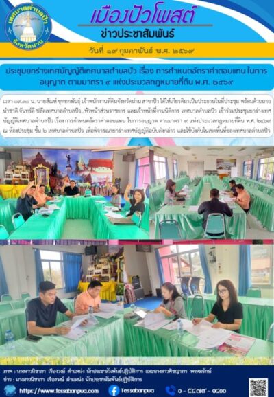 วันที่ ๑๙ กุมภาพันธ์ พ.ศ. ๒๕๖๙ เวลา ๐๙.๓๐ น. นายสัณห์ ขุททกพันธุ์ เจ้าพนักงานที่ดินจังหวัดน่าน สาขาปัว ได้ให้เกียรติมาเป็นประธานในที่ประชุม พร้อมด้วยนายนำชาติ จันทร์ดี ปลัดเทศบาลตำบลปัว , หัวหน้าส่วนราชการ และเจ้าหน้าที่งานนิติการ เทศบาลตำบลปัว เข้าร่วมประชุมยกร่างเทศบัญญัติเทศบาลตำบลปัว เรื่อง การกำหนดอัตราค่าตอบแทน ในการอนุญาต ตามมาตรา ๙ แห่งประมวลกฎหมายที่ดิน พ.ศ. ๒๔๖๙