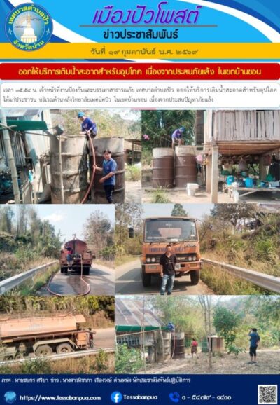 วันที่ ๑๙ กุมภาพันธ์ พ.ศ. ๒๕๖๙ เวลา ๑๕.๕๔ น. เจ้าหน้าที่งานป้องกันและบรรเทาสาธารณภัย เทศบาลตำบลปัว ออกให้บริการเติมน้ำสะอาดสำหรับอุปโภค ให้แก่ประชาชน บริเวณด้านหลังวิทยาลัยเทคนิคปัว ในเขตบ้านขอน เนื่องจากประสบปัญหาภัยแล้ง
