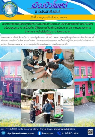 วันที่ ๑๙ กุมภาพันธ์ พ.ศ. ๒๕๖๙ เวลา ๑๖.๒๐ น. เจ้าหน้าที่งานบริการการแพทย์ฉุกเฉิน เทศบาลตำบลปัว ออกตรวจสอบอุบัติเหตุรถจักรยานยนต์ชนท้ายรถยนต์ บริเวณทางแยกเข้าวัดบ้านร้อง ริมถนนบ้านร้อง – บ้านนาป่าน พร้อมปฐมพยาบาลเบื้องต้นแก่ผู้ได้รับบาดเจ็บ ซึ่งเป็นเด็กนักเรียน เพศชาย มีบาดแผลถลอกตามร่างกาย และนำส่งไปรักษา ณ โรงพยาบาลสมเด็จพระยุพราชปัว