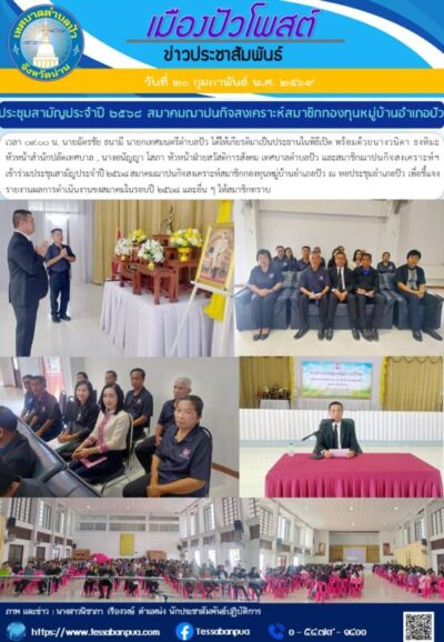 วันที่ ๒๐ กุมภาพันธ์ พ.ศ. ๒๕๖๙ เวลา ๐๙.๐๐ น. นายฉัตรชัย ธนามี นายกเทศมนตรีตำบลปัว ได้ให้เกียรติมาเป็นประธานในพิธีเปิด พร้อมด้วยนางวนิดา ธงหิมะ หัวหน้าสำนักปลัดเทศบาล , นางอนัญญา โสภา หัวหน้าฝ่ายสวัสดิการสังคม เทศบาลตำบลปัว และสมาชิกฌาปนกิจสงเคราะห์ฯ เข้าร่วมประชุมสามัญประจำปี ๒๕๖๘ สมาคมฌาปนกิจสงเคราะห์สมาชิกกองทุนหมู่บ้านอำเภอปัว ณ หอประชุมอำเภอปัว เพื่อชี้แจงรายงานผลการดำเนินงานขงสมาคมในรอบปี ๒๕๖๘ และอื่น ๆ ให้สมาชิกทราบ