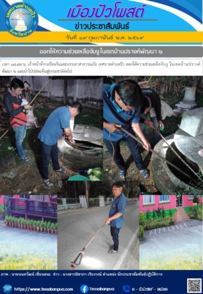 วันที่ ๑๙ กุมภาพันธ์ พ.ศ. ๒๕๖๙ เวลา ๑๘.๔๗ น. เจ้าหน้าที่งานป้องกันและบรรเทาสาธารณภัย เทศบาลตำบลปัว ออกให้ความช่วยเหลือจับงู ในเขตบ้านปรางค์พัฒนา ๒ และนำไปปล่อยคืนสู่ธรรมชาติต่อไป